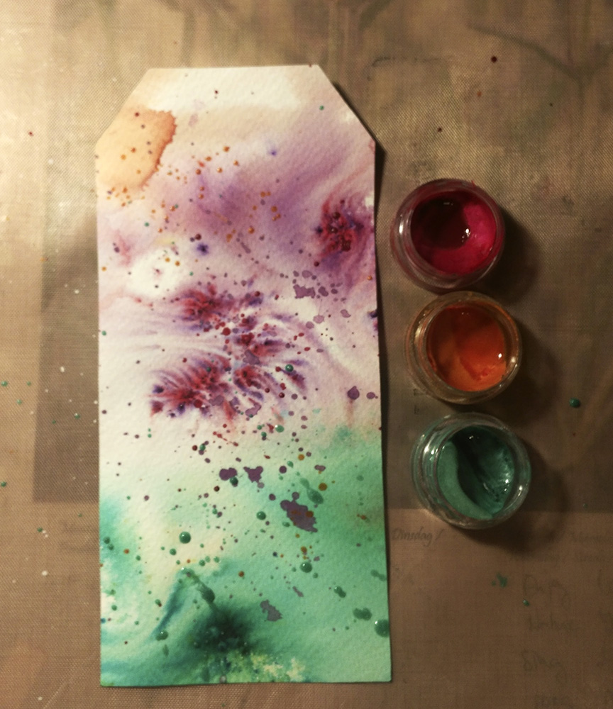 Jeg ville ha litt farge med skimmer i også, så jeg brukte Twinkling H2Os (husk at de må aktiveres med vann - vent et par minutter til det løser seg opp) og skvettet malinga her og der med en pensel. Vent til en farge er tørr før du legger på den neste: